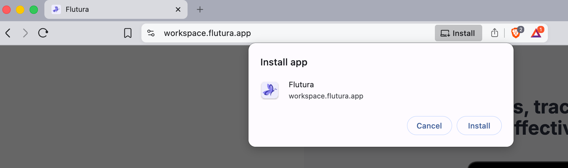 The install icon only appears in Chromium-based browsers (Chrome, Edge, Brave, Arc). If you are using Firefox, you will not see it. Switch to Chrome or Edge and visit workspace.flutura.app.