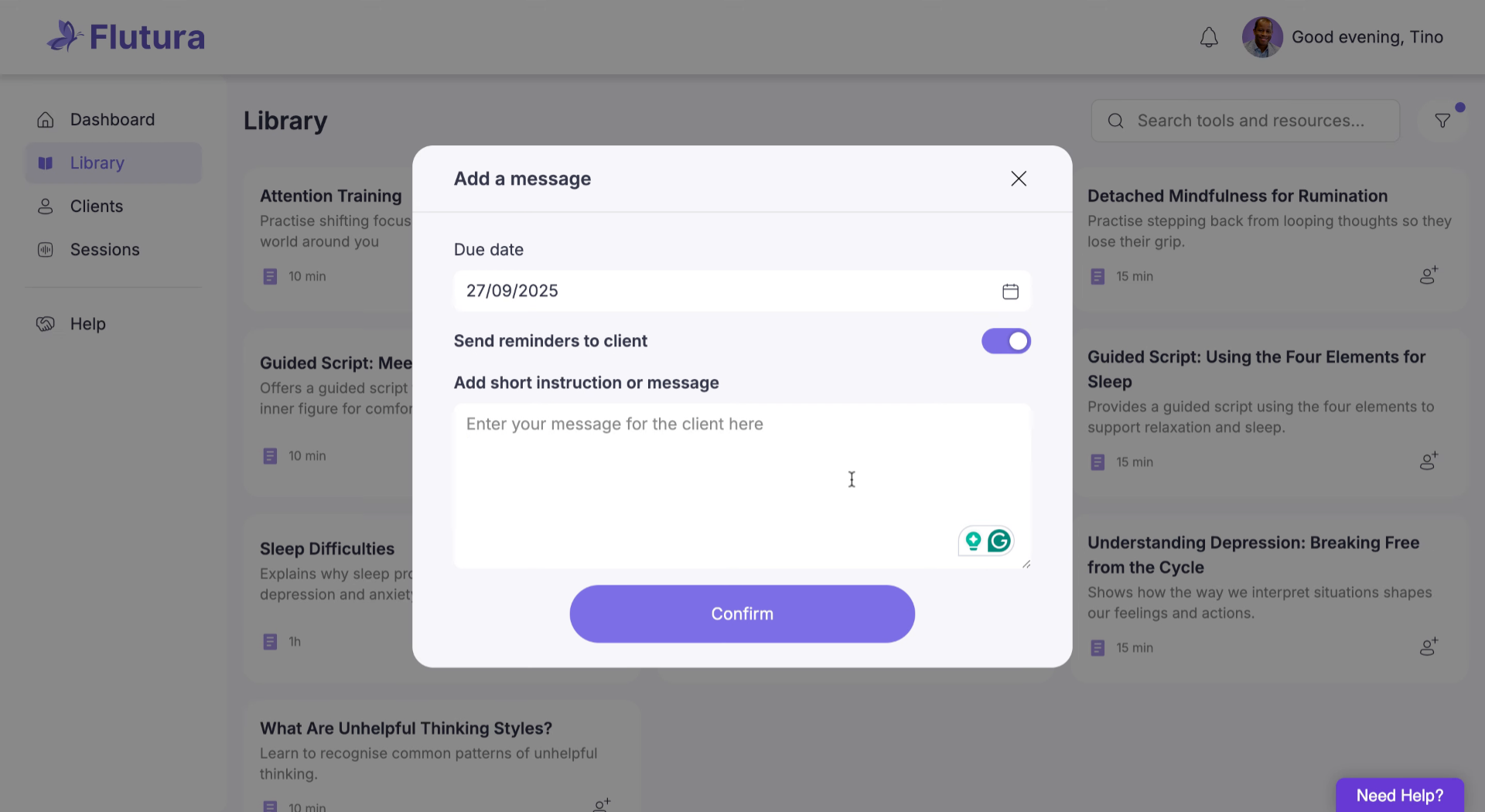 Set due date. You can also choose whether to send a notification to the client. Or add an optional short- note with extra guidance or encouragement.